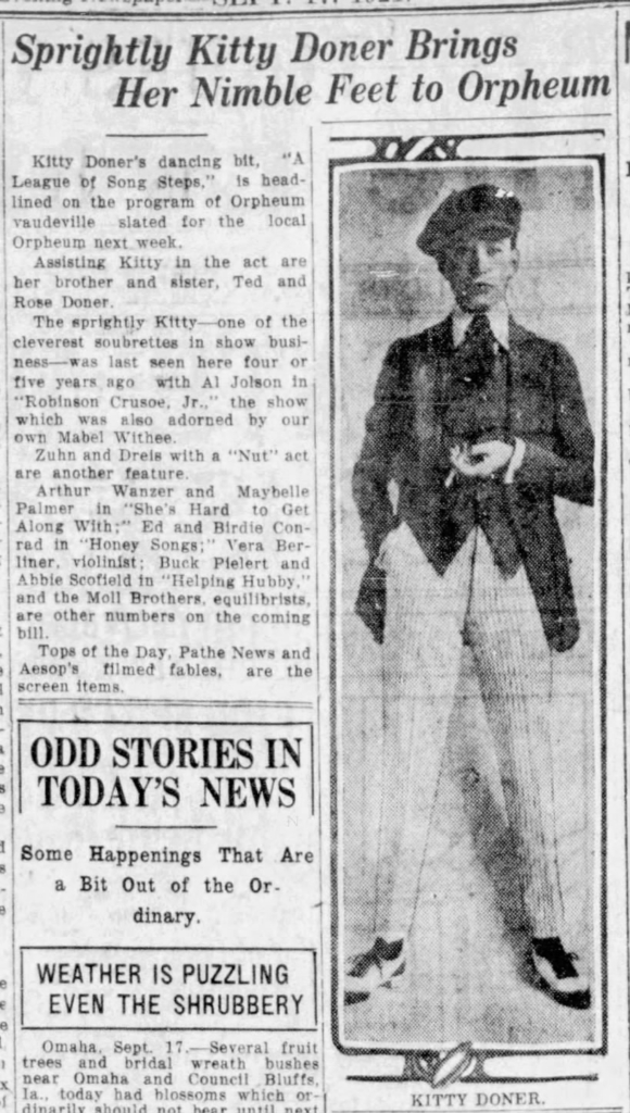 Doner was born on September 6, 1895 in Chicago, Illinois, the eldest of three siblings. Both of Doner’s parents were in show business, with her mother, Nellie Mordecai, even starting her career as a male impersonator in English “pantos”. Kitty Doner’s first professional stage appearance was in 1905, as a canary in the children’s ballet at the New York Hippodrome. Her father suggested she become a male impersonator, and she had her first solo vaudeville act at 16 in 1911.